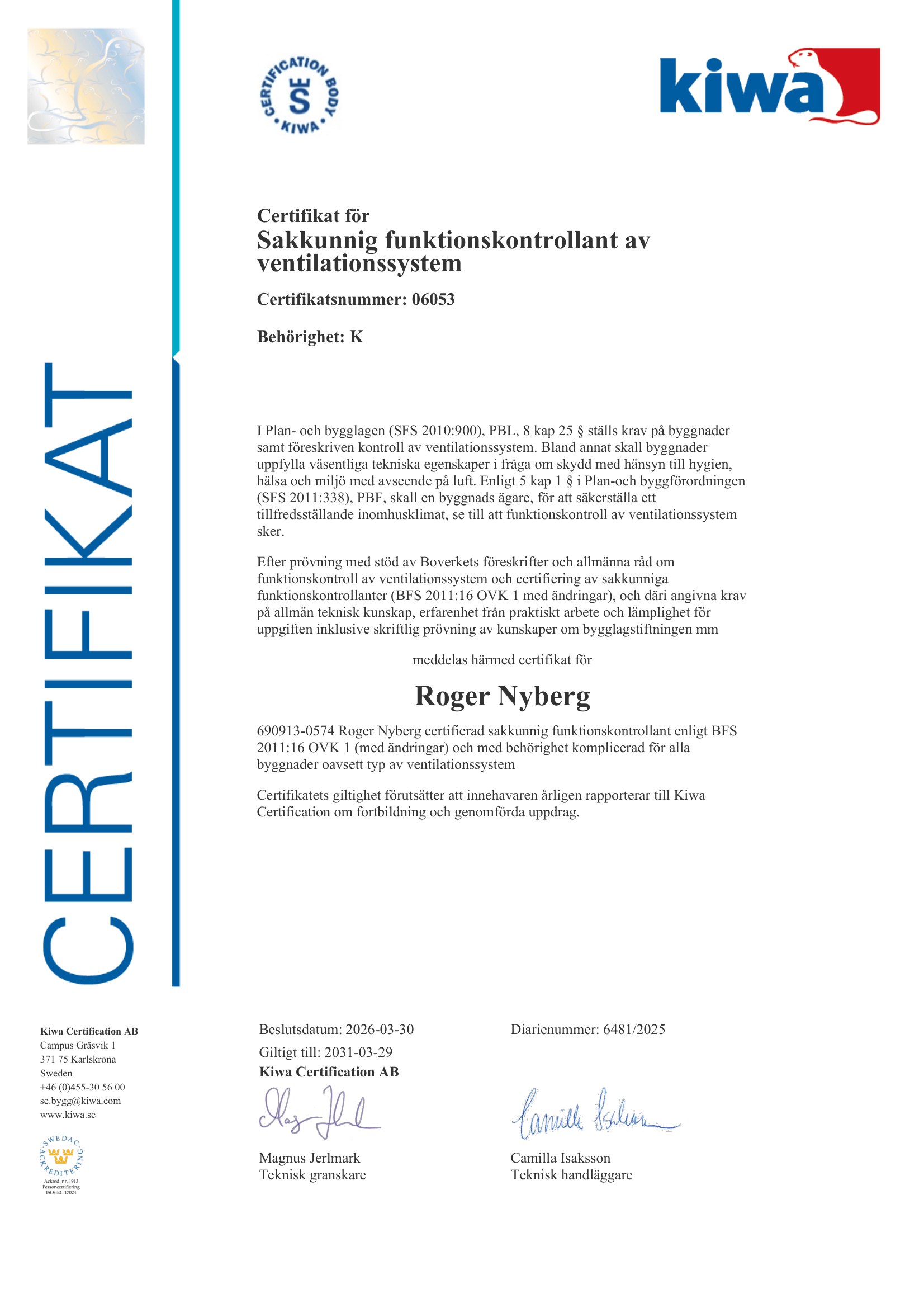 Roger har enligt de gällande krav förnyat sin OVK-certifiering och utfört kunskapsprov med väl godkända resultat. OVK-kontroller är en stor del av vårt arbete och vi är stolta att kunna uppvisa diplom och certifikat.